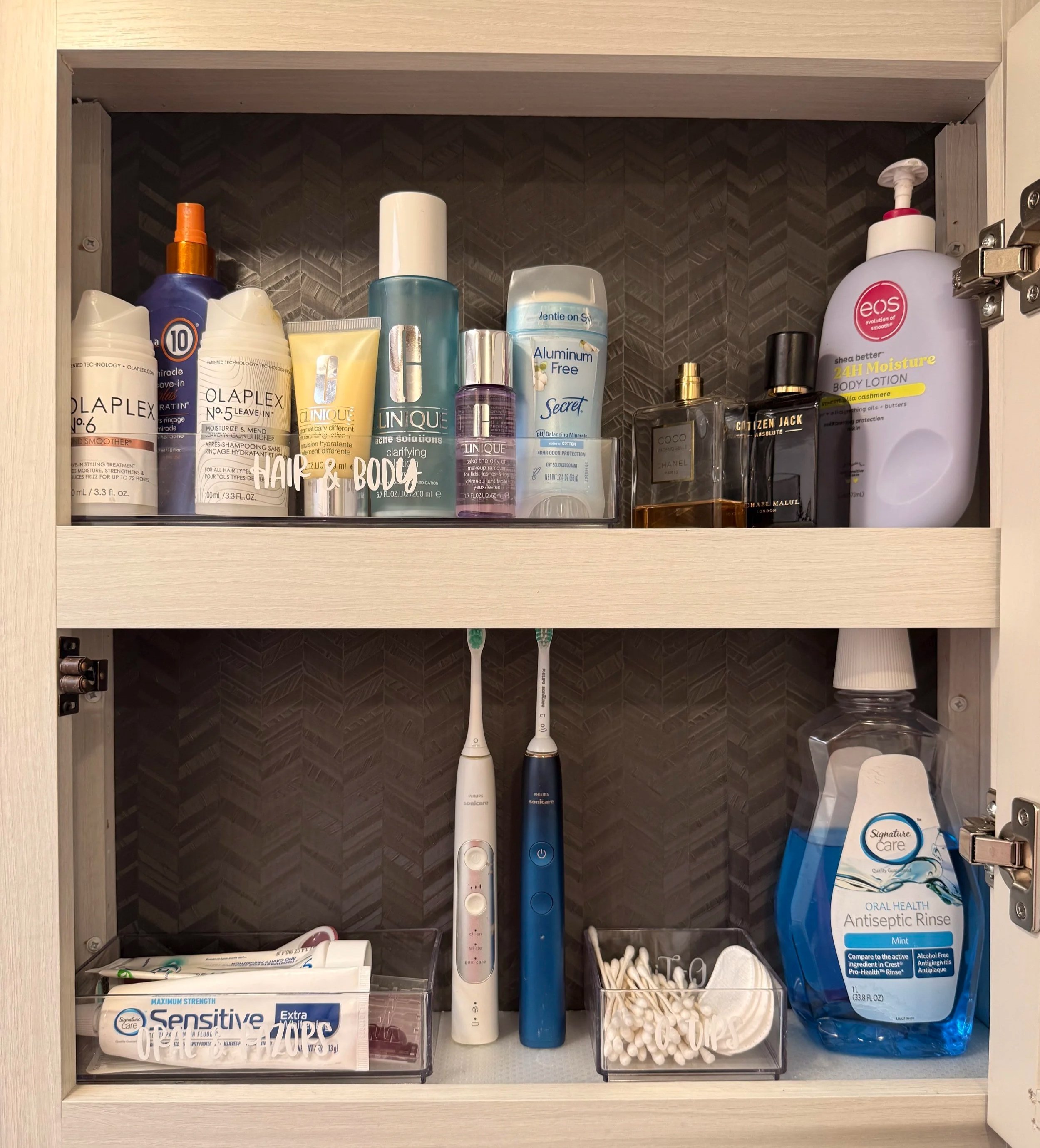Pro Tip: If you are ever struggling with pantry space in an RV, get stackable clear bins, you can maximize tall cabinet space (but don’t forget top measure your space first!!!) You can find pre-measured clear bins on my Etsy page www.etsy/clutterfreespaces.com